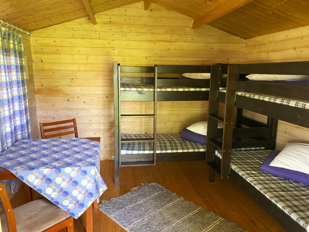 - Keturvietis kempingo namelis, namelyje dviaukštės lovos, patalynė, stalas, kėdės, lauko WC